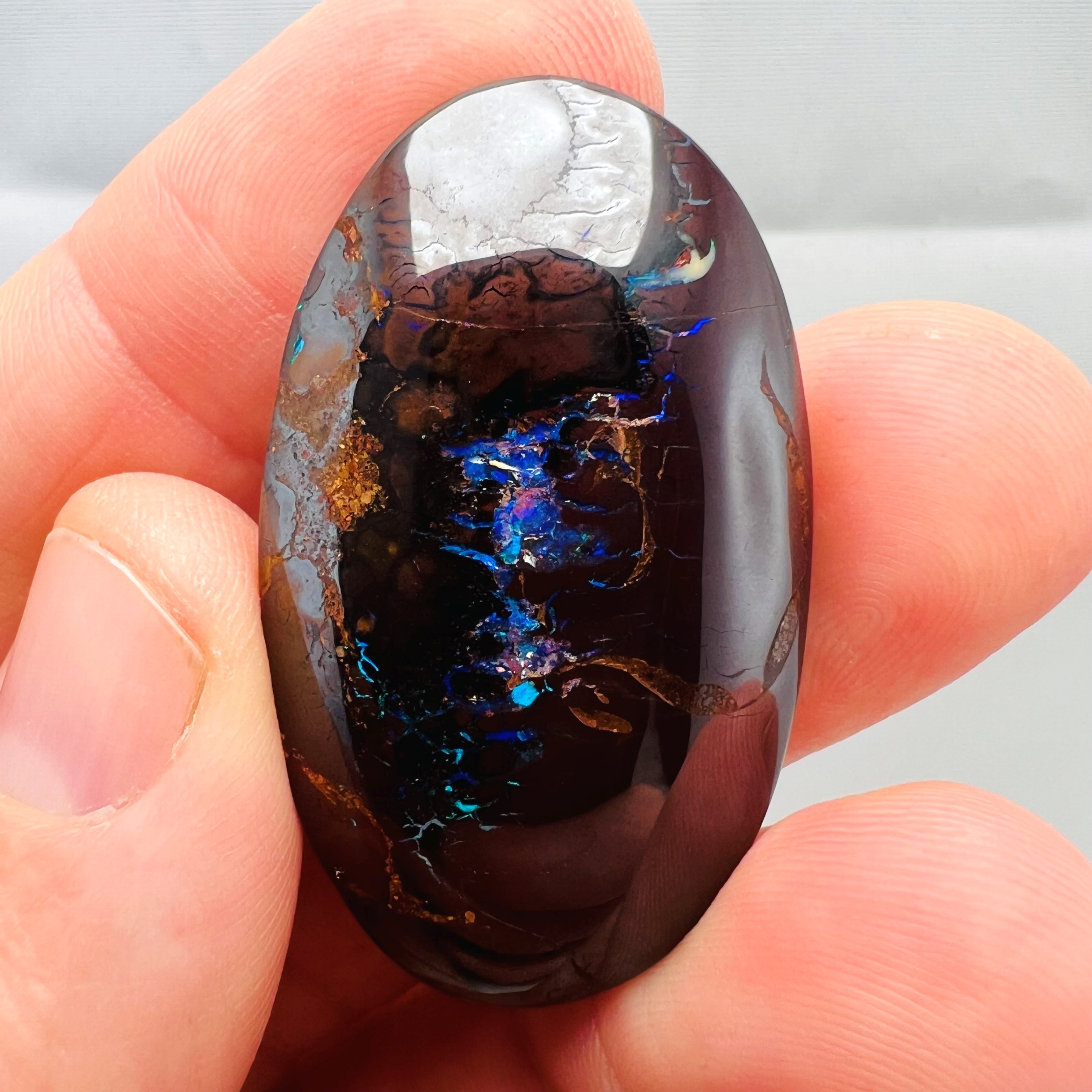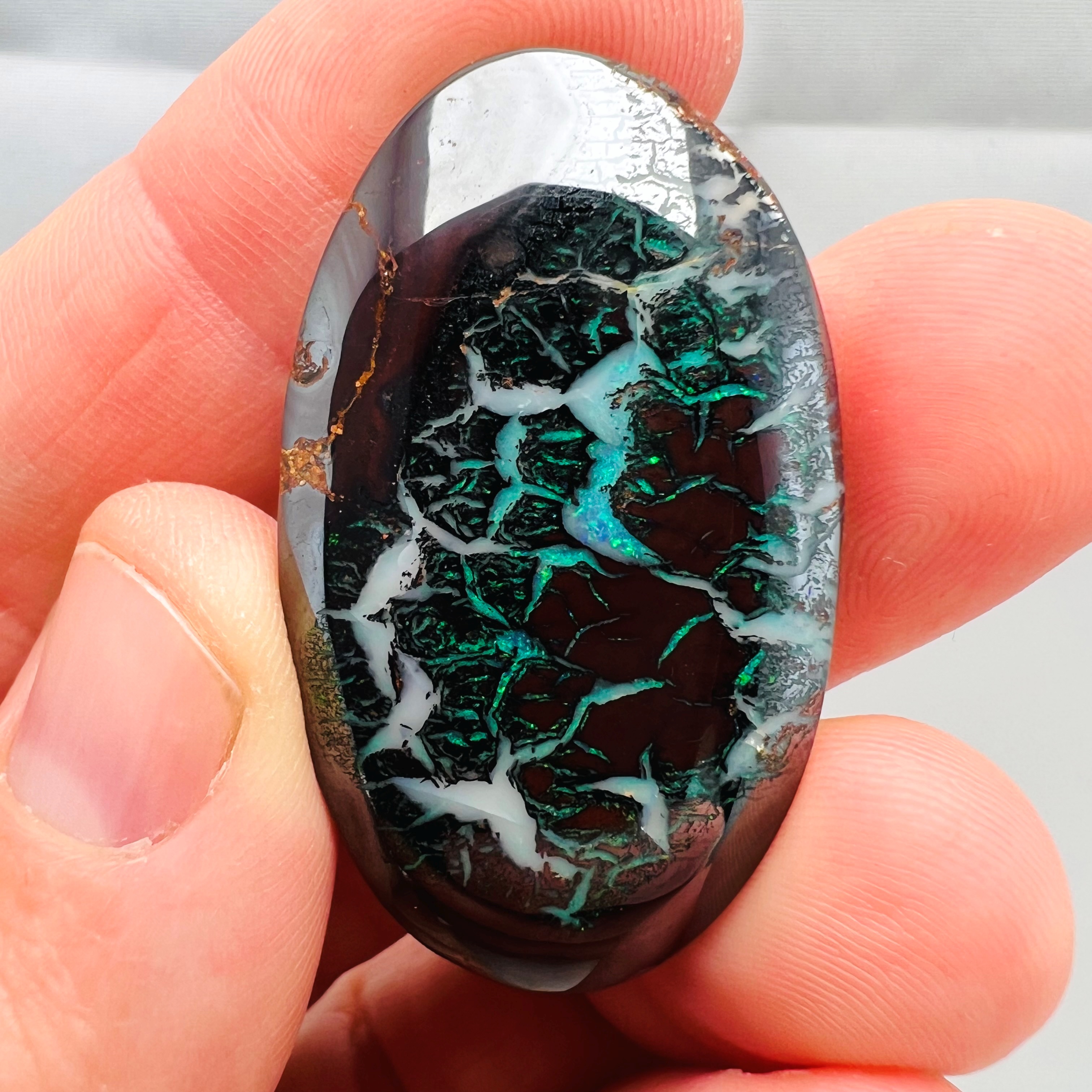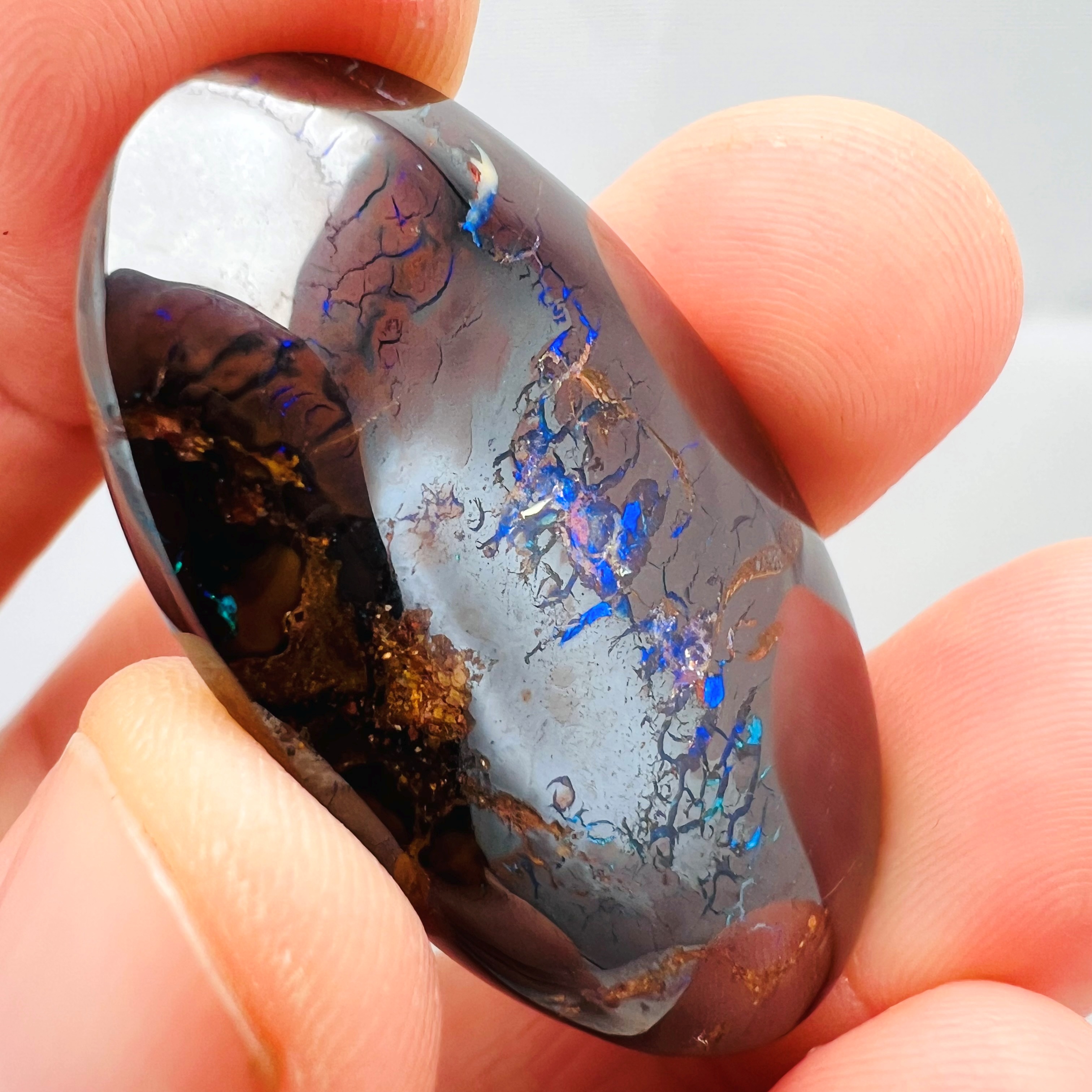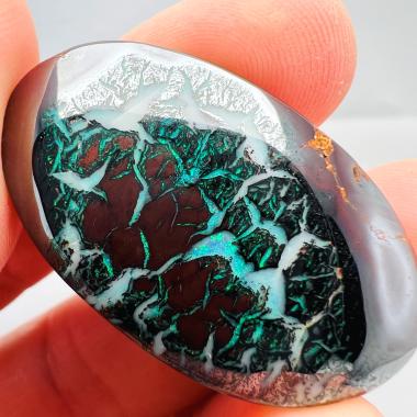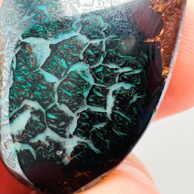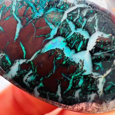 Why is it called Dark Iron Matrix? This type of boulder opal has a dark matrix and is as hard as iron. This allows for an extremely high-gloss polish, comparable to metal, although the reverse side requires significantly more work. The dark tone of the stone's body highlights the veins of colored opal embedded within the matrix. Photographs are difficult to take due to the stones' reflections. Dark Iron Matrix opals are among the most sought-after boulder opals!