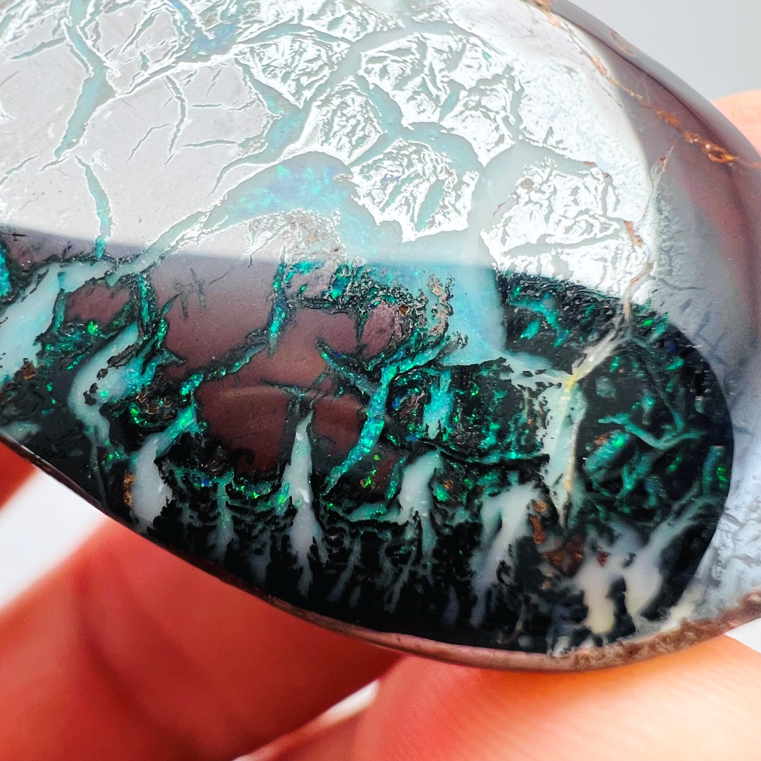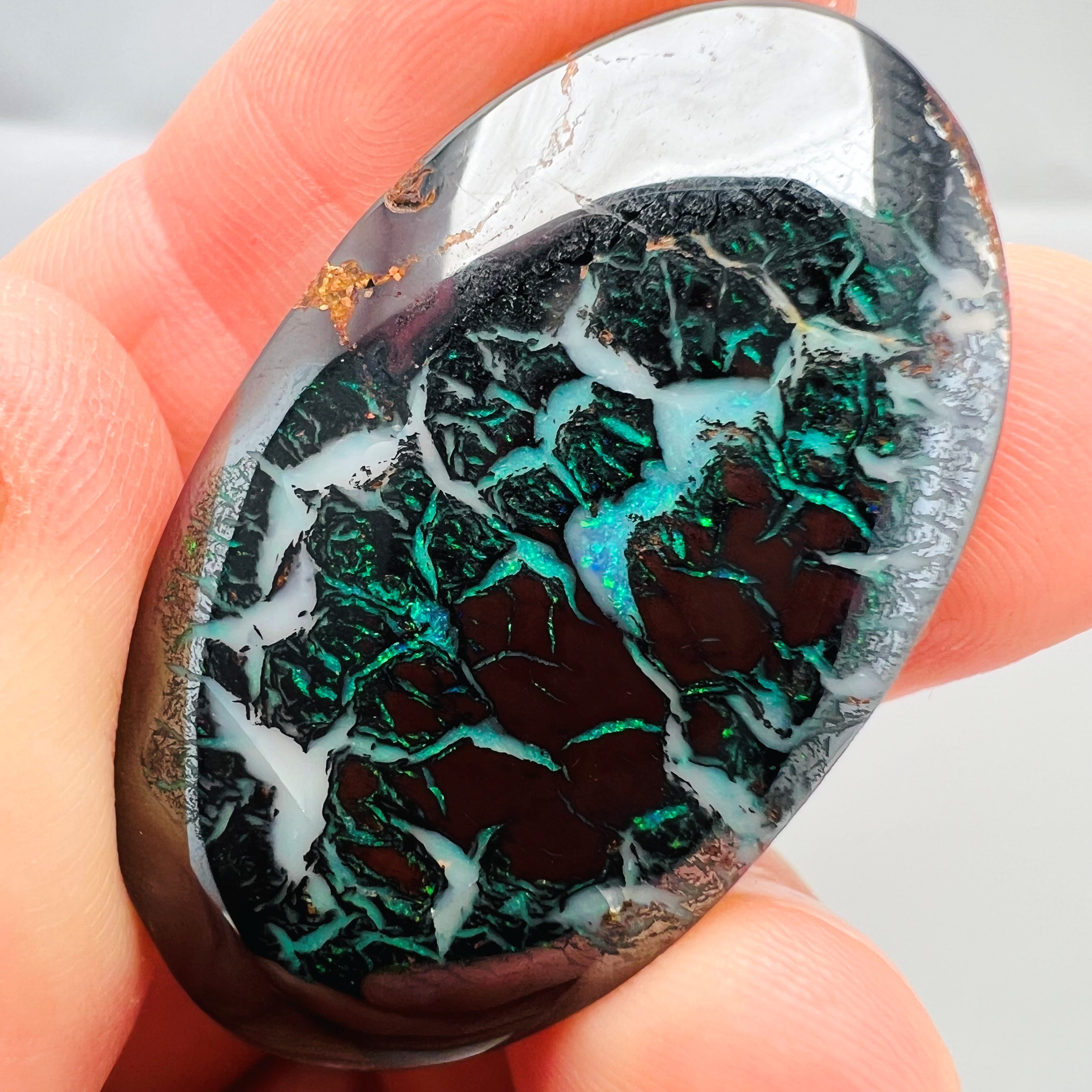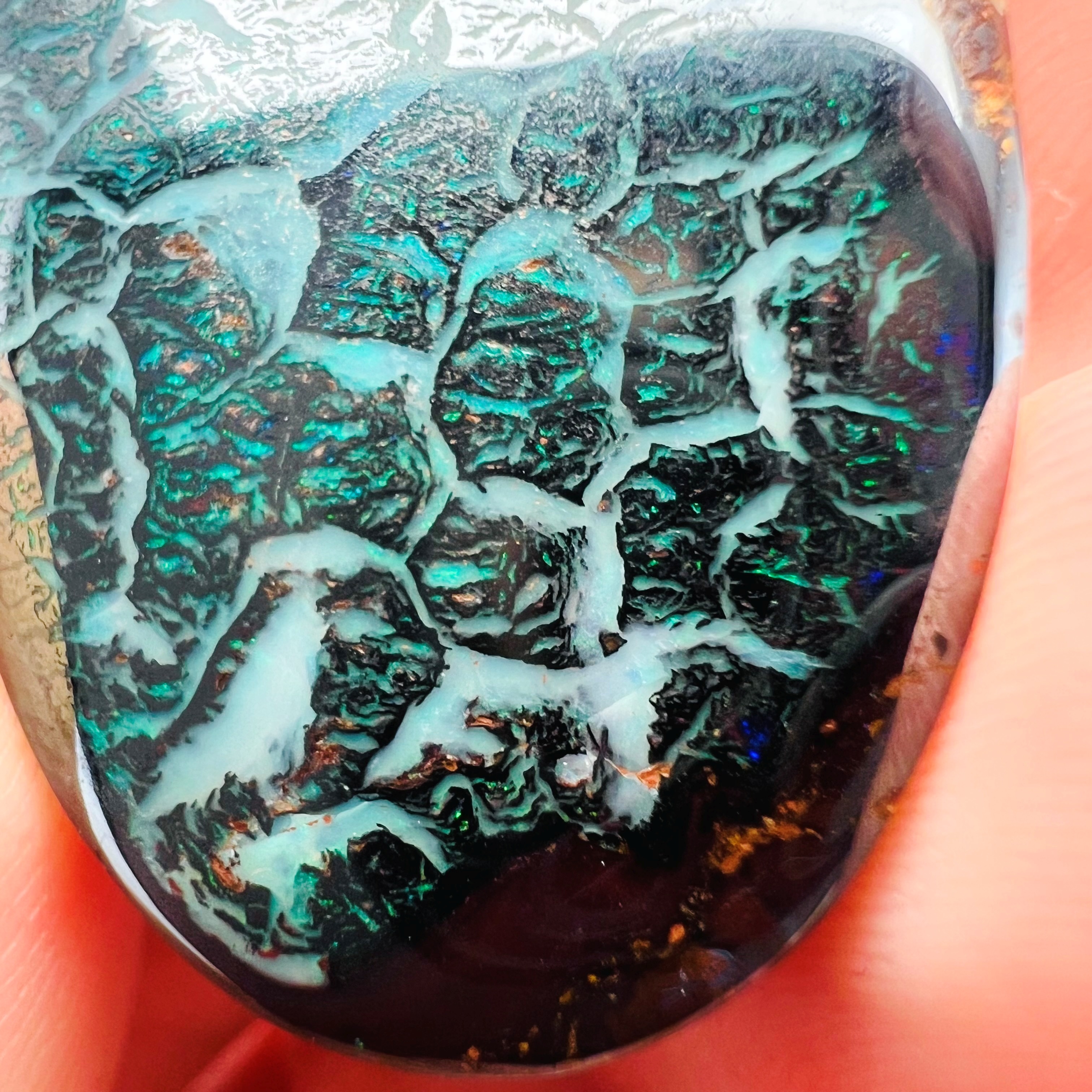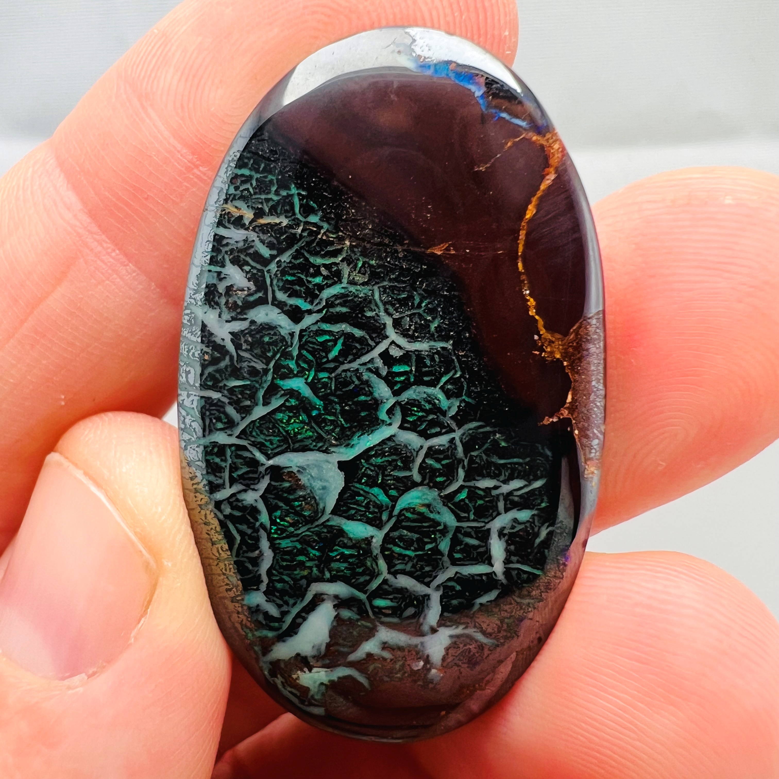Why is it called Dark Iron Matrix? This type of boulder opal has a dark matrix and is as hard as iron. This allows for an extremely high-gloss polish, comparable to metal, although the reverse side requires significantly more work. The dark tone of the stone's body highlights the veins of colored opal embedded within the matrix. Photographs are difficult to take due to the stones' reflections. Dark Iron Matrix opals are among the most sought-after boulder opals!