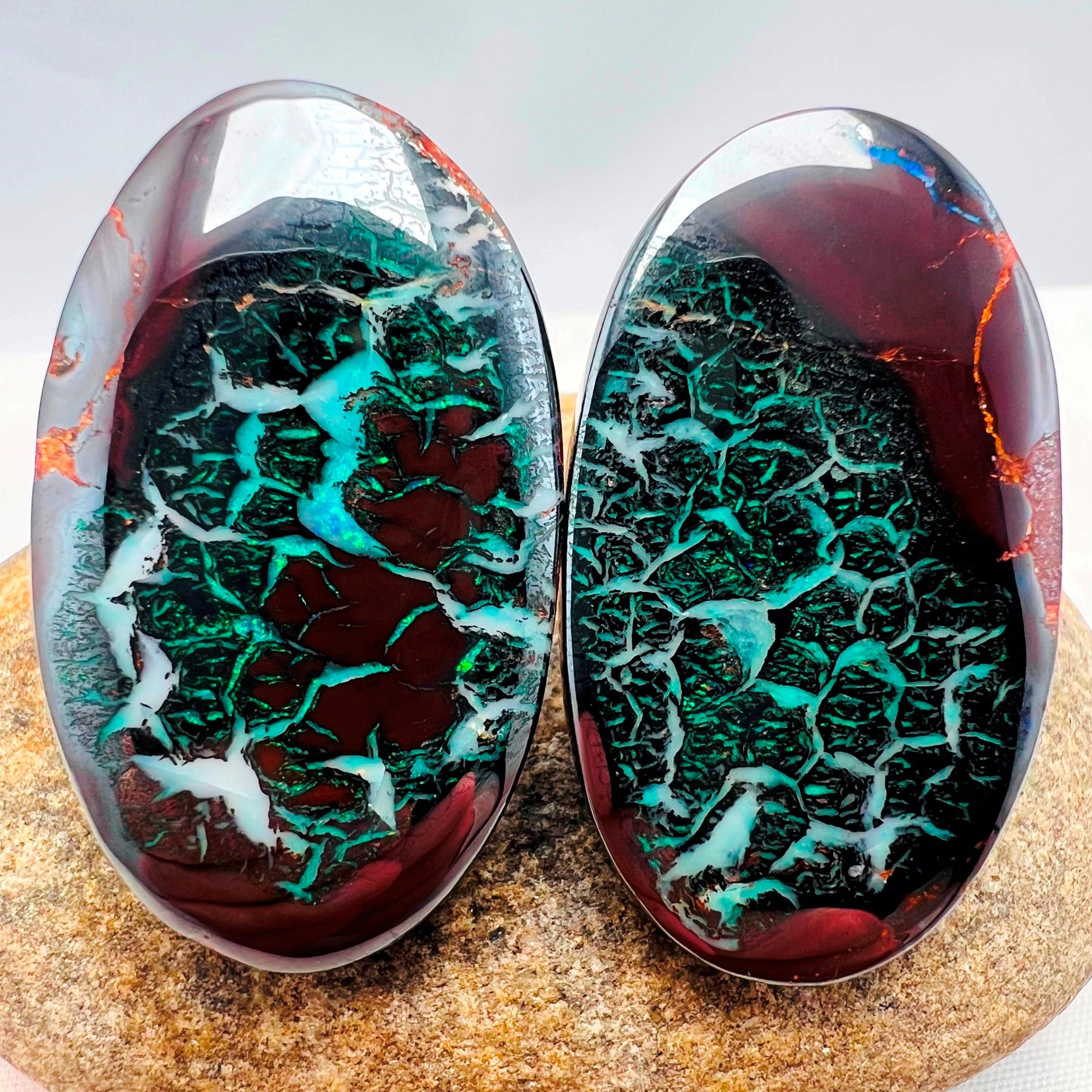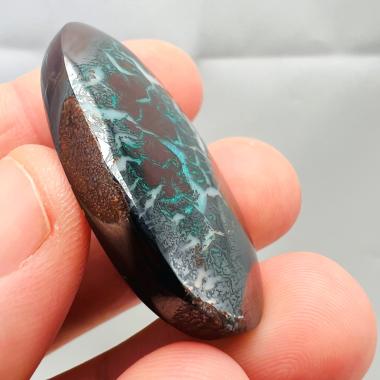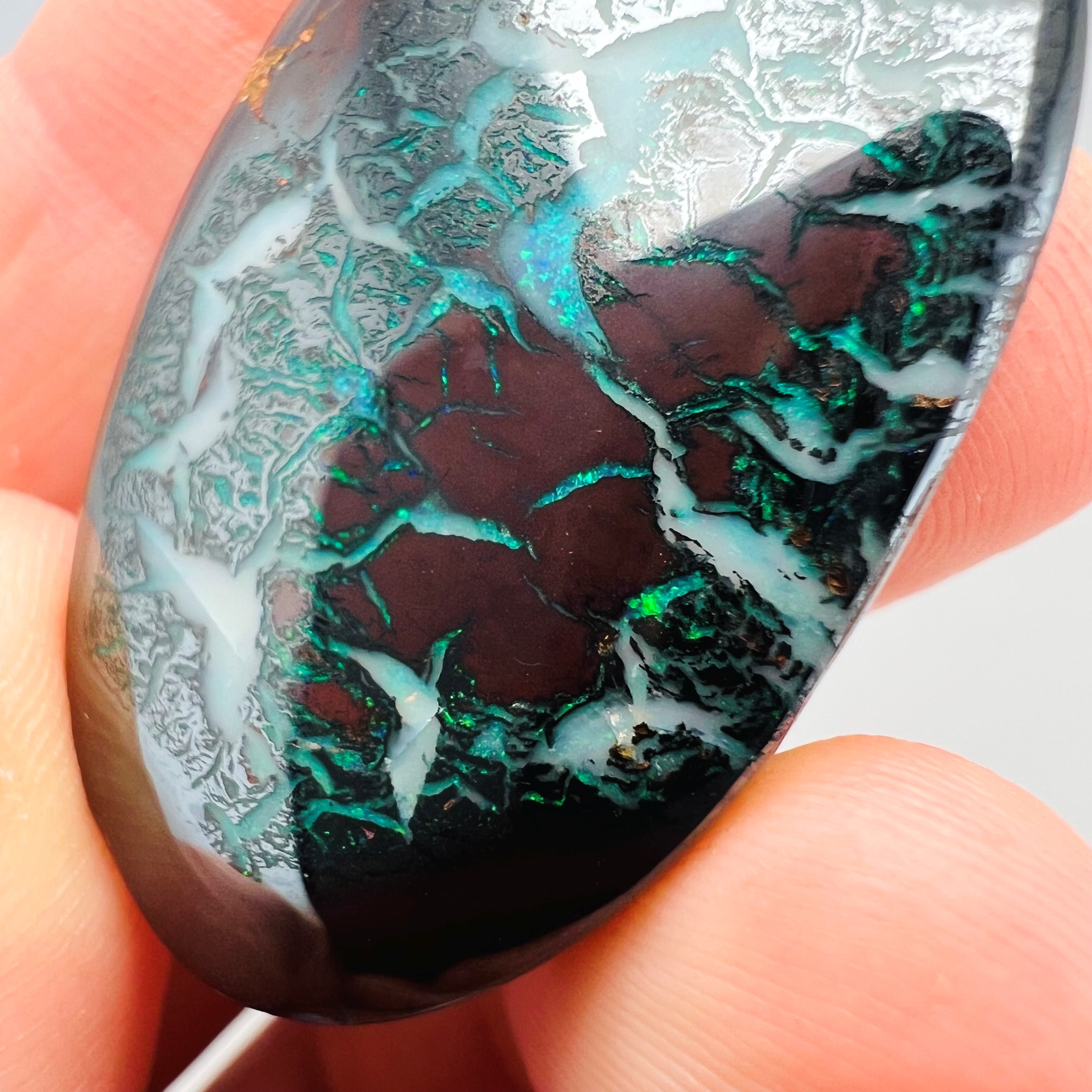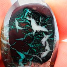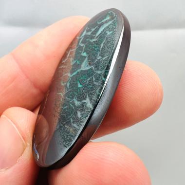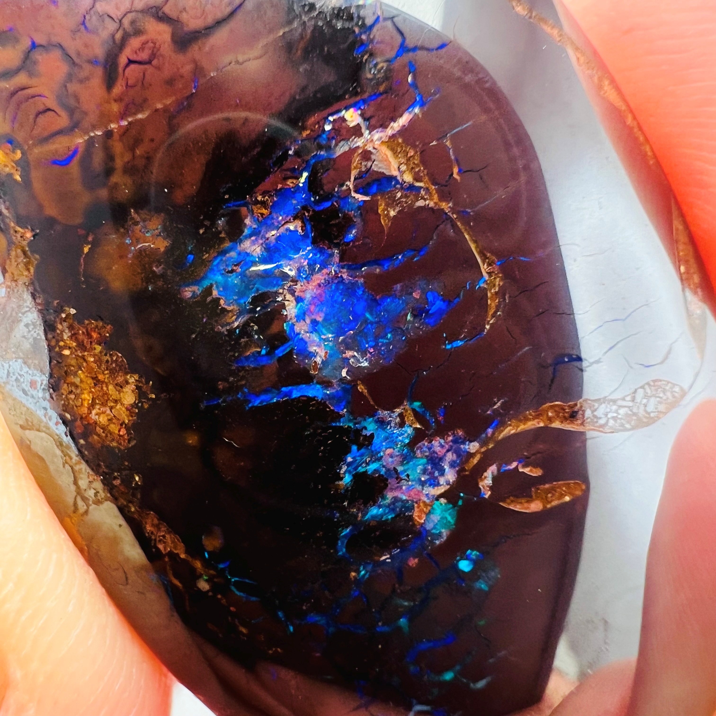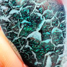 Why is it called Dark Iron Matrix? This type of boulder opal has a dark matrix and is as hard as iron. This allows for an extremely high-gloss polish, comparable to metal, although the reverse side requires significantly more work. The dark tone of the stone's body highlights the veins of colored opal embedded within the matrix. Photographs are difficult to take due to the stones' reflections. Dark Iron Matrix opals are among the most sought-after boulder opals!
