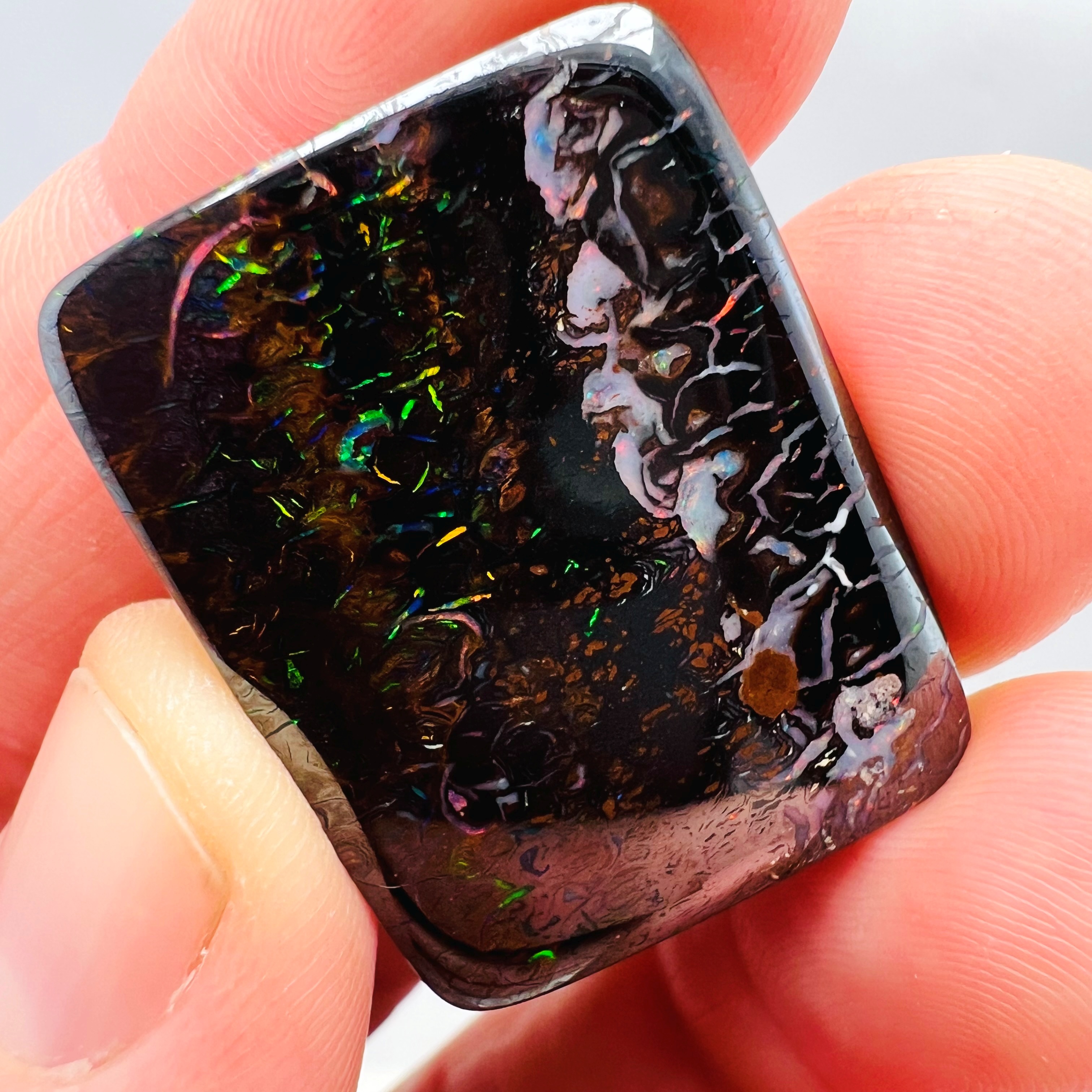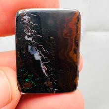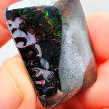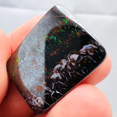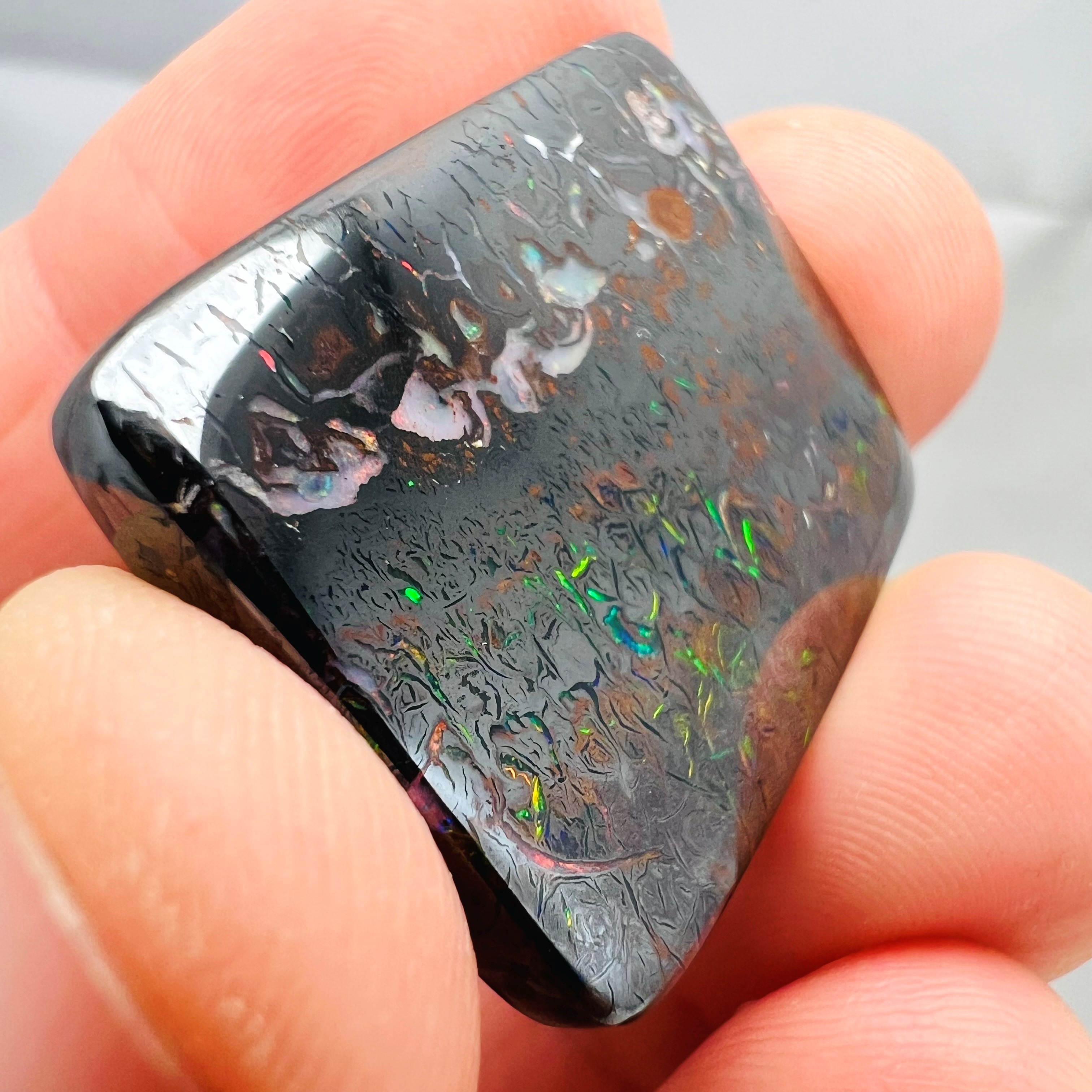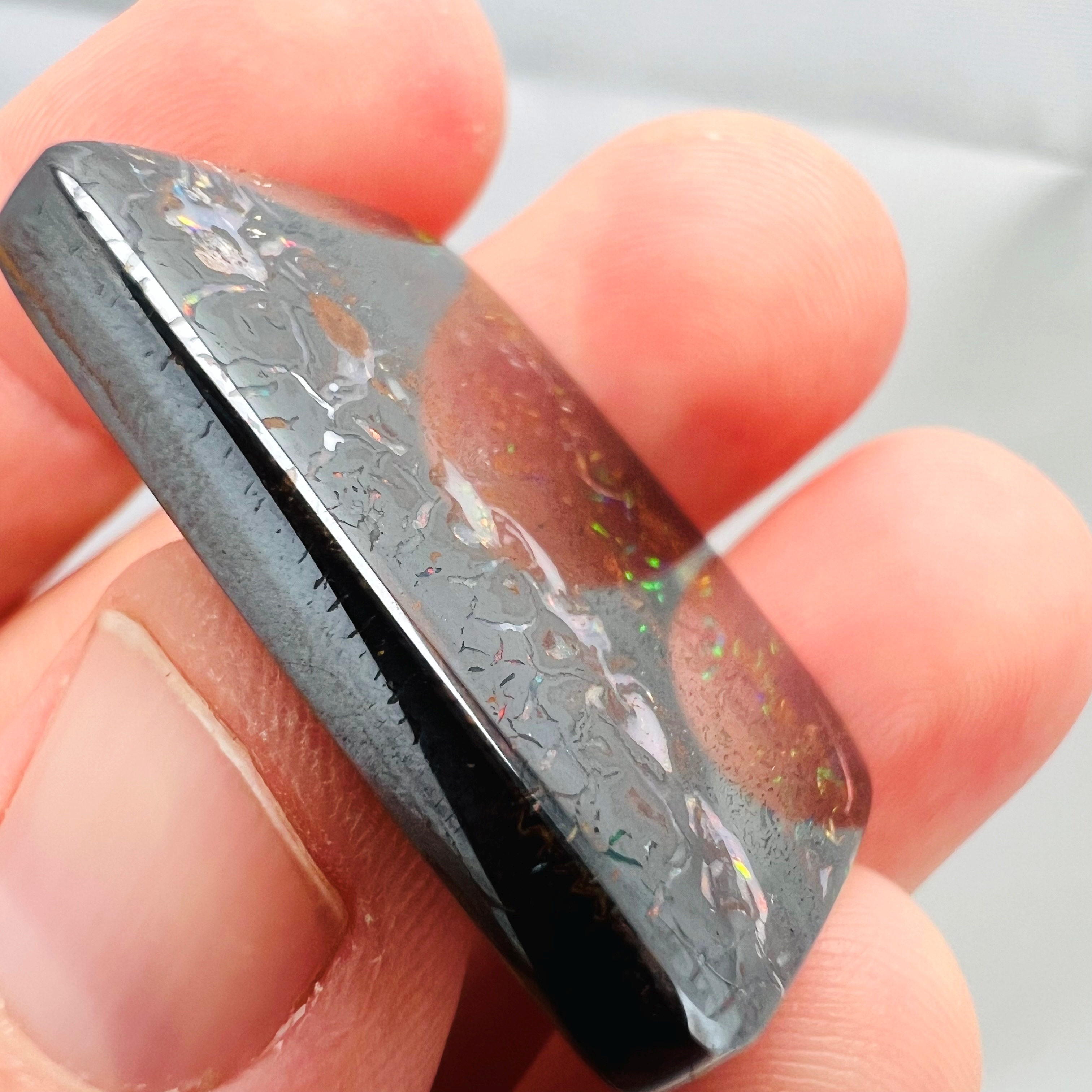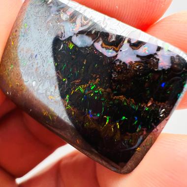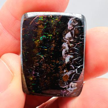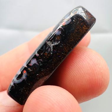 Why is it called Dark Iron Matrix? This type of boulder opal has a dark matrix and is as hard as iron. This allows for an extremely high-gloss polish, comparable to metal, although the reverse side requires significantly more work. The dark tone of the stone's body highlights the veins of colored opal embedded within the matrix. Photographs are difficult to take due to the stones' reflections. Dark Iron Matrix opals are among the most sought-after boulder opals!