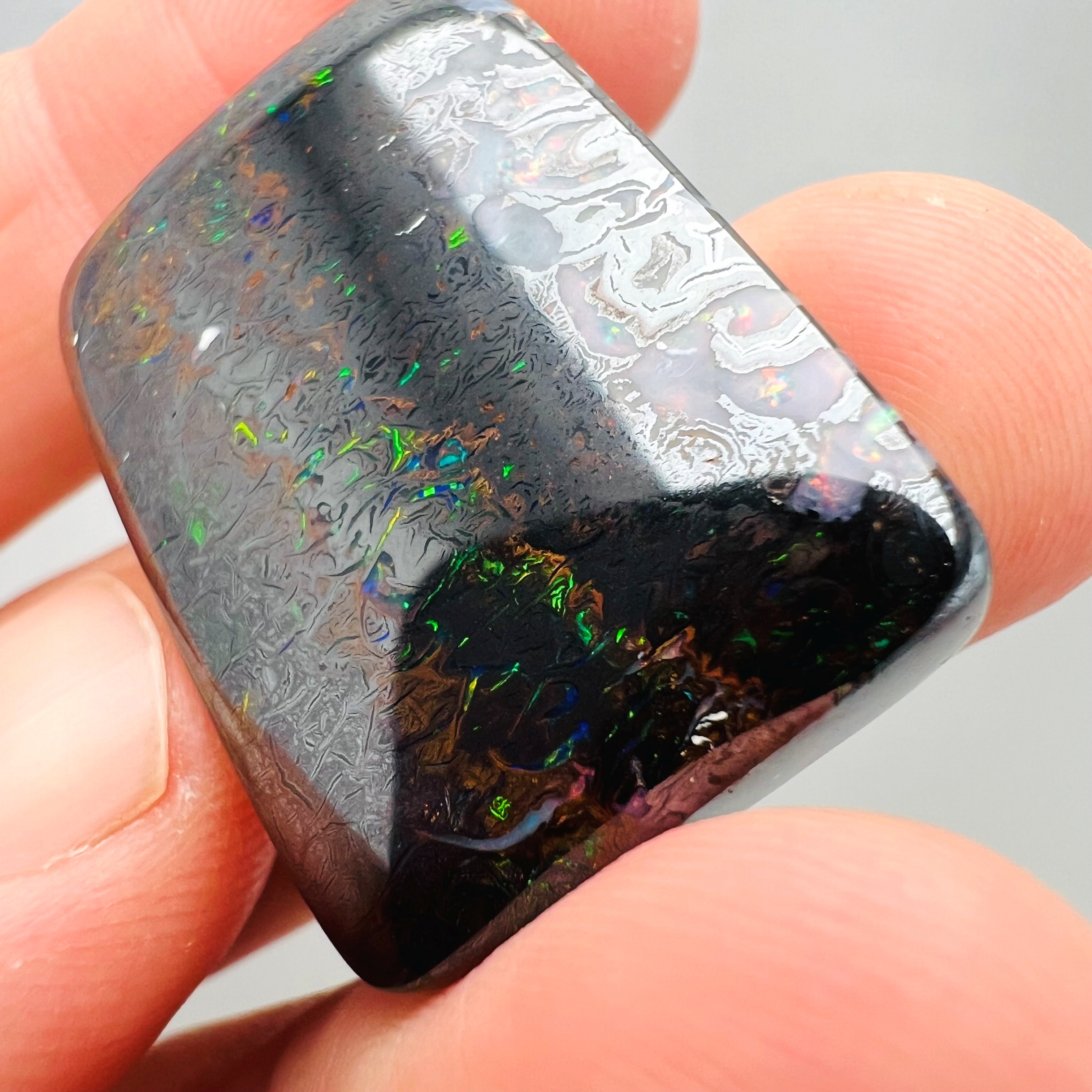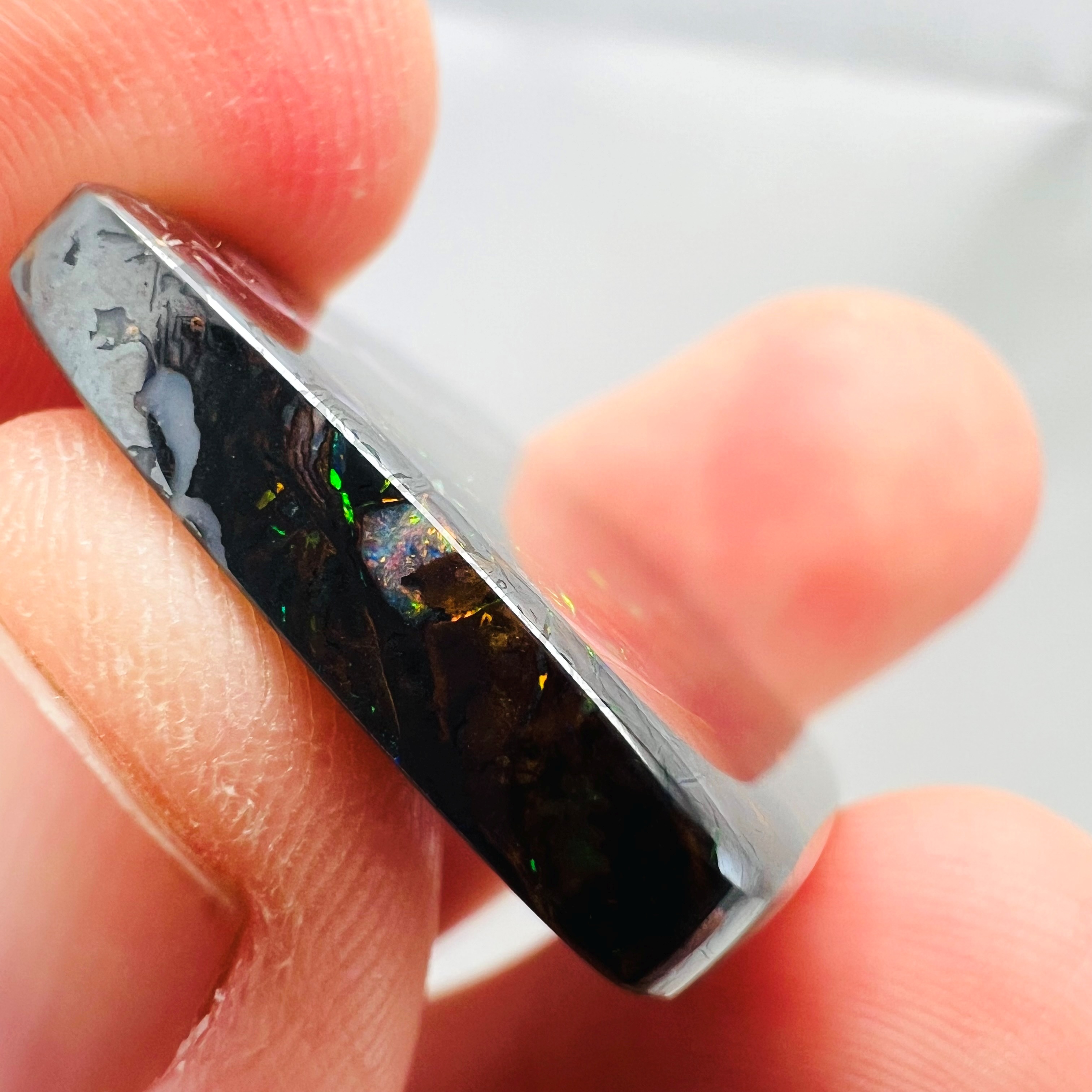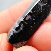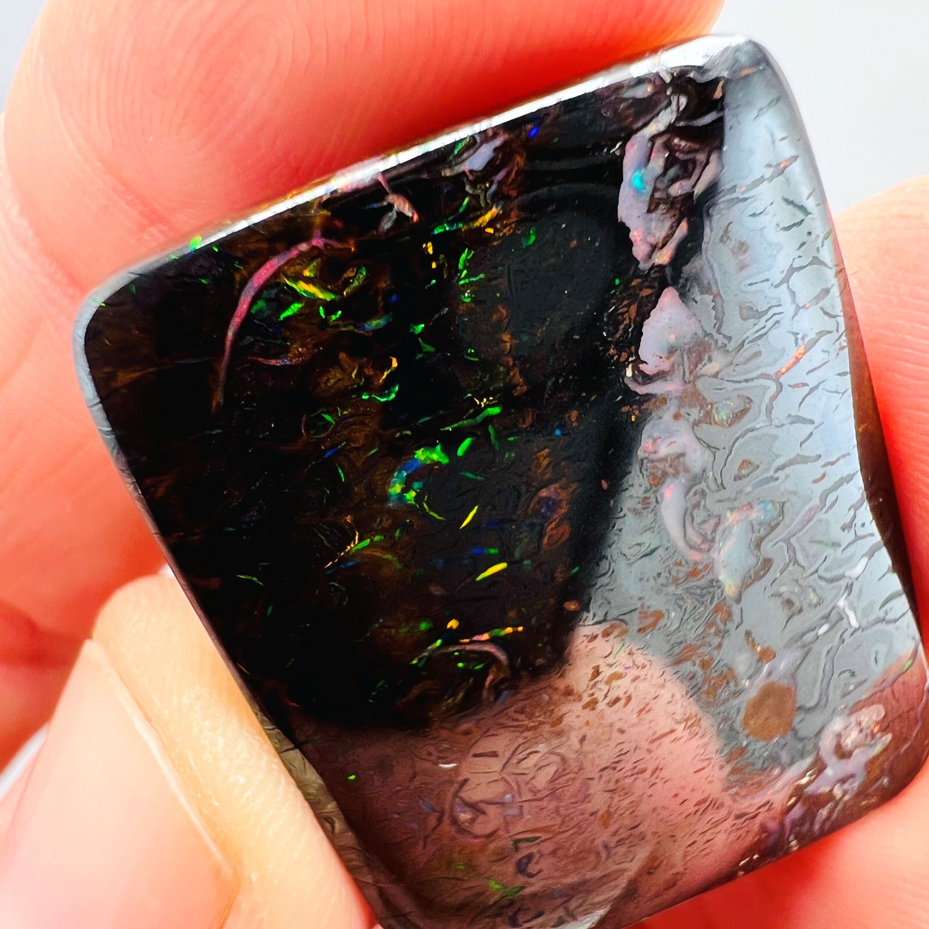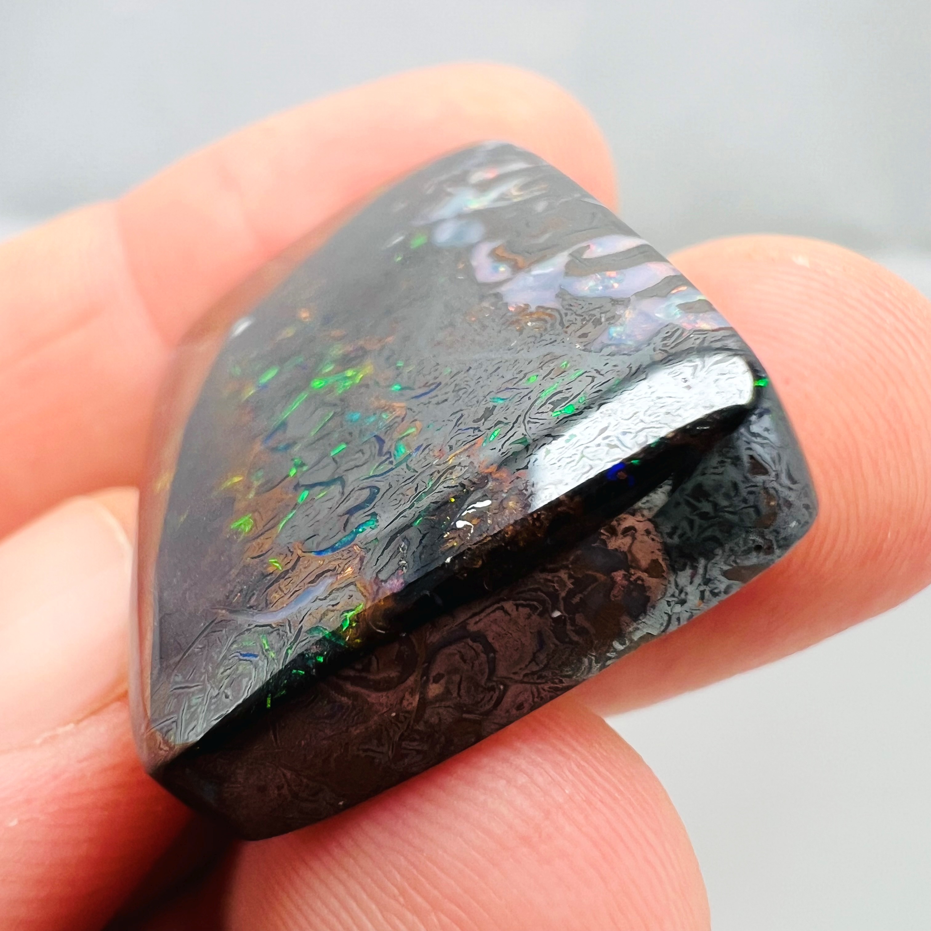 Why is it called Dark Iron Matrix? This type of boulder opal has a dark matrix and is as hard as iron. This allows for an extremely high-gloss polish, comparable to metal, although the reverse side requires significantly more work. The dark tone of the stone's body highlights the veins of colored opal embedded within the matrix. Photographs are difficult to take due to the stones' reflections. Dark Iron Matrix opals are among the most sought-after boulder opals!