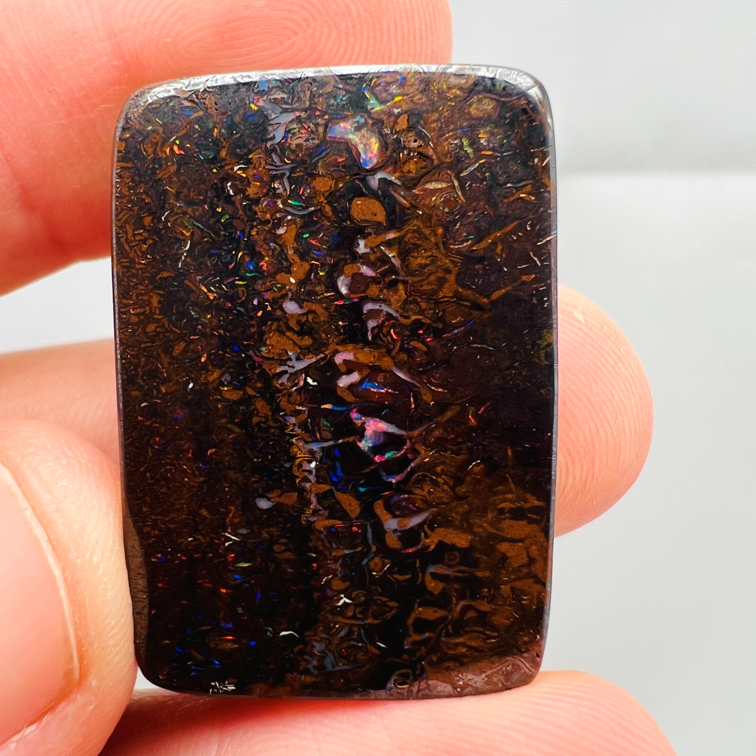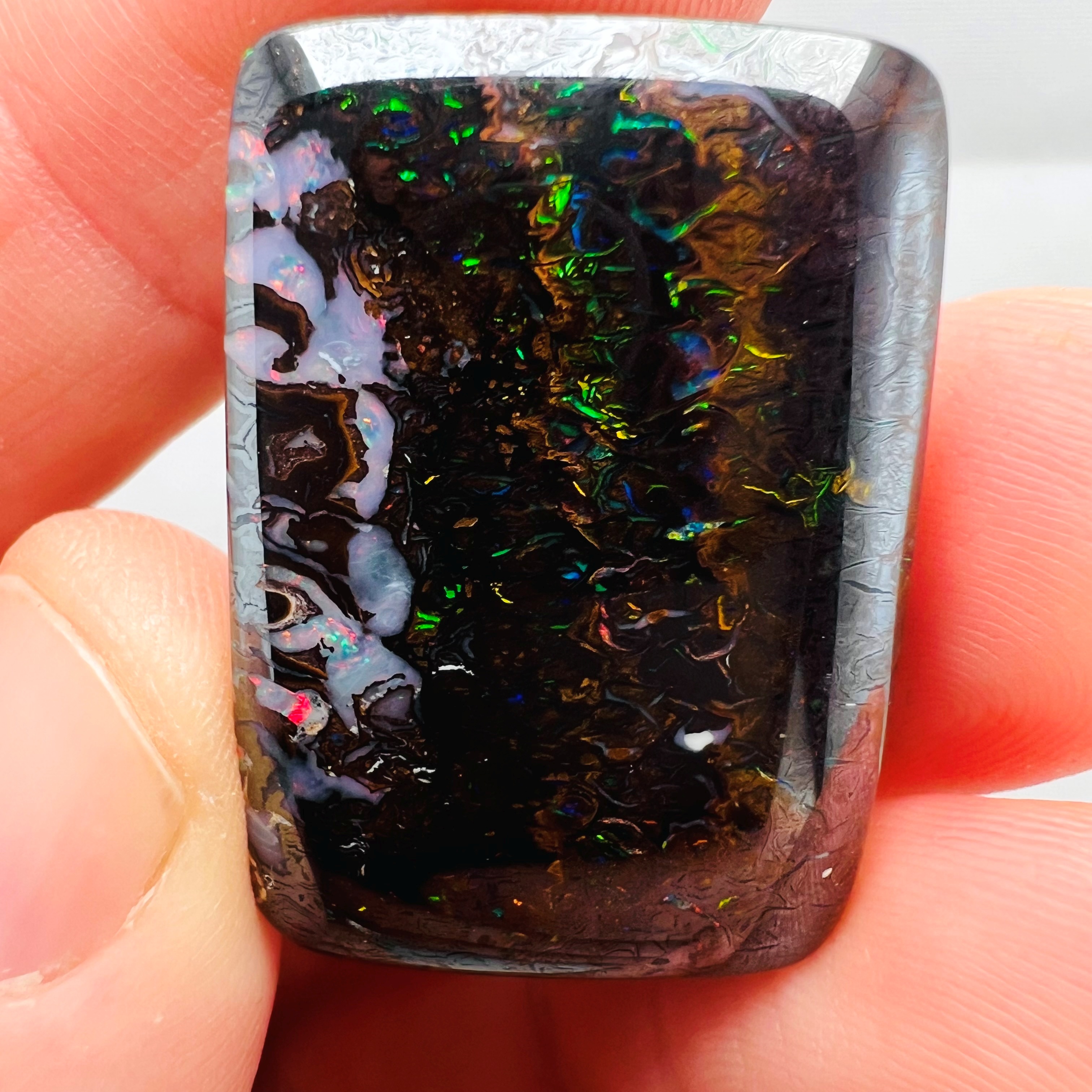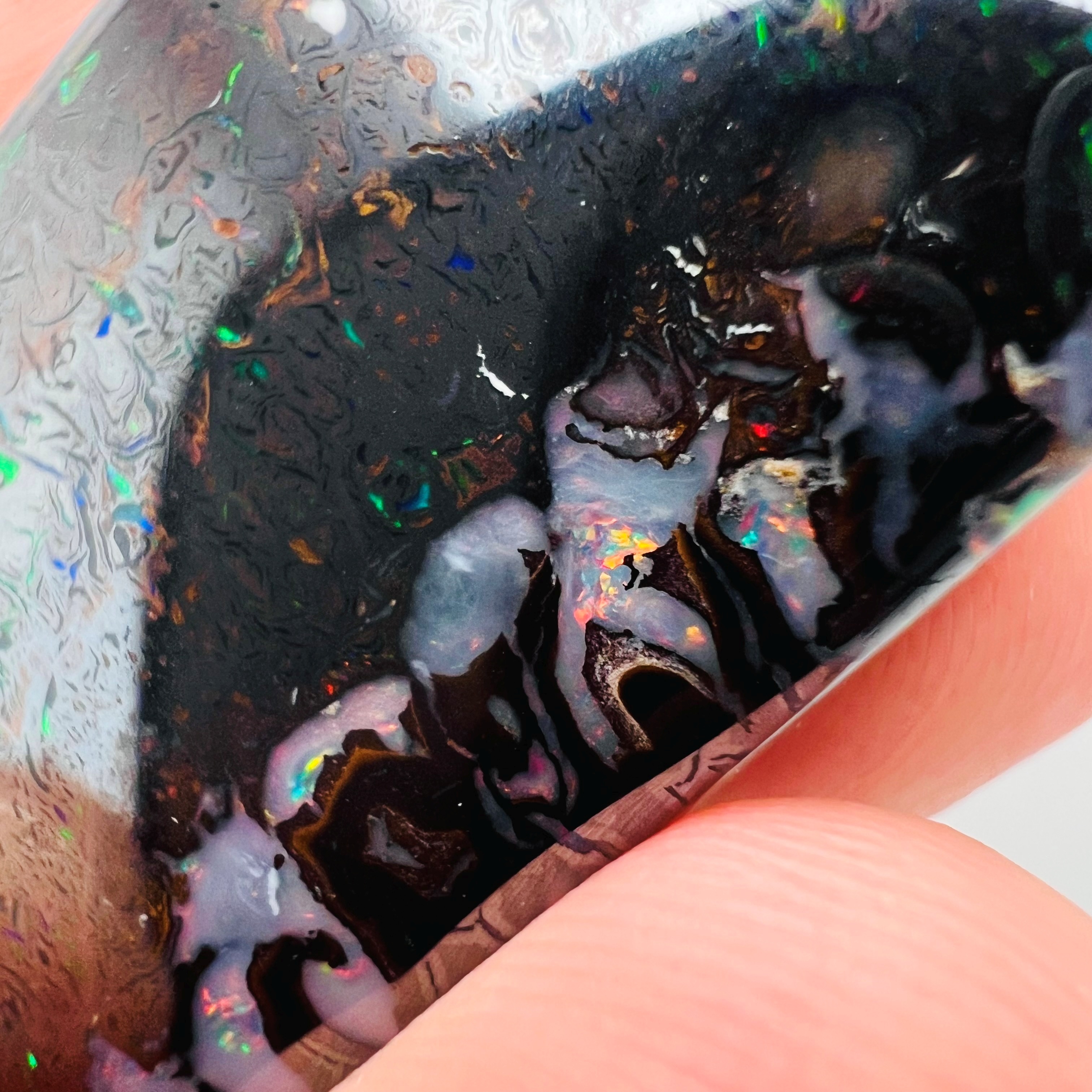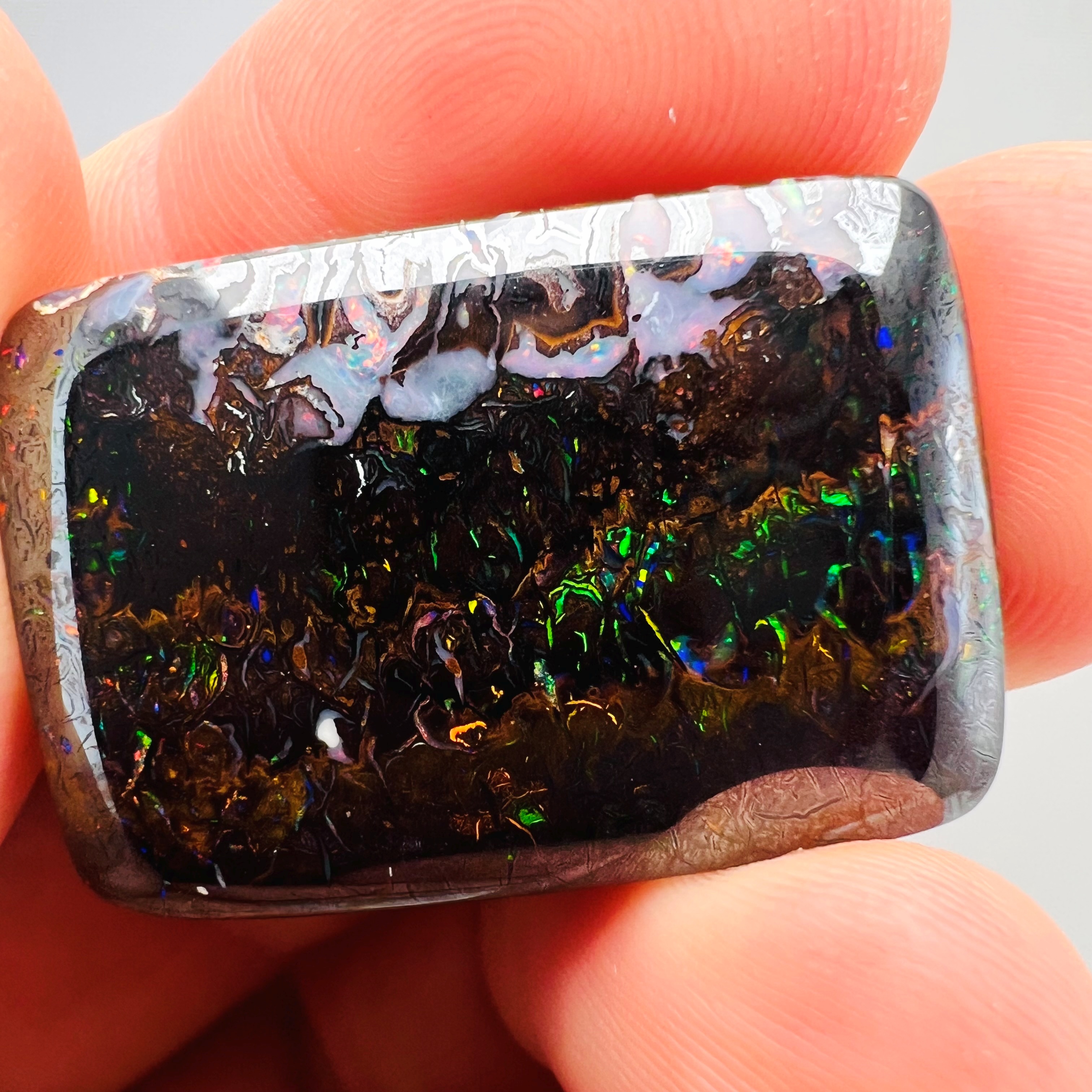 Why is it called Dark Iron Matrix? This type of boulder opal has a dark matrix and is as hard as iron. This allows for an extremely high-gloss polish, comparable to metal, although the reverse side requires significantly more work. The dark tone of the stone's body highlights the veins of colored opal embedded within the matrix. Photographs are difficult to take due to the stones' reflections. Dark Iron Matrix opals are among the most sought-after boulder opals!