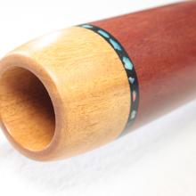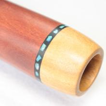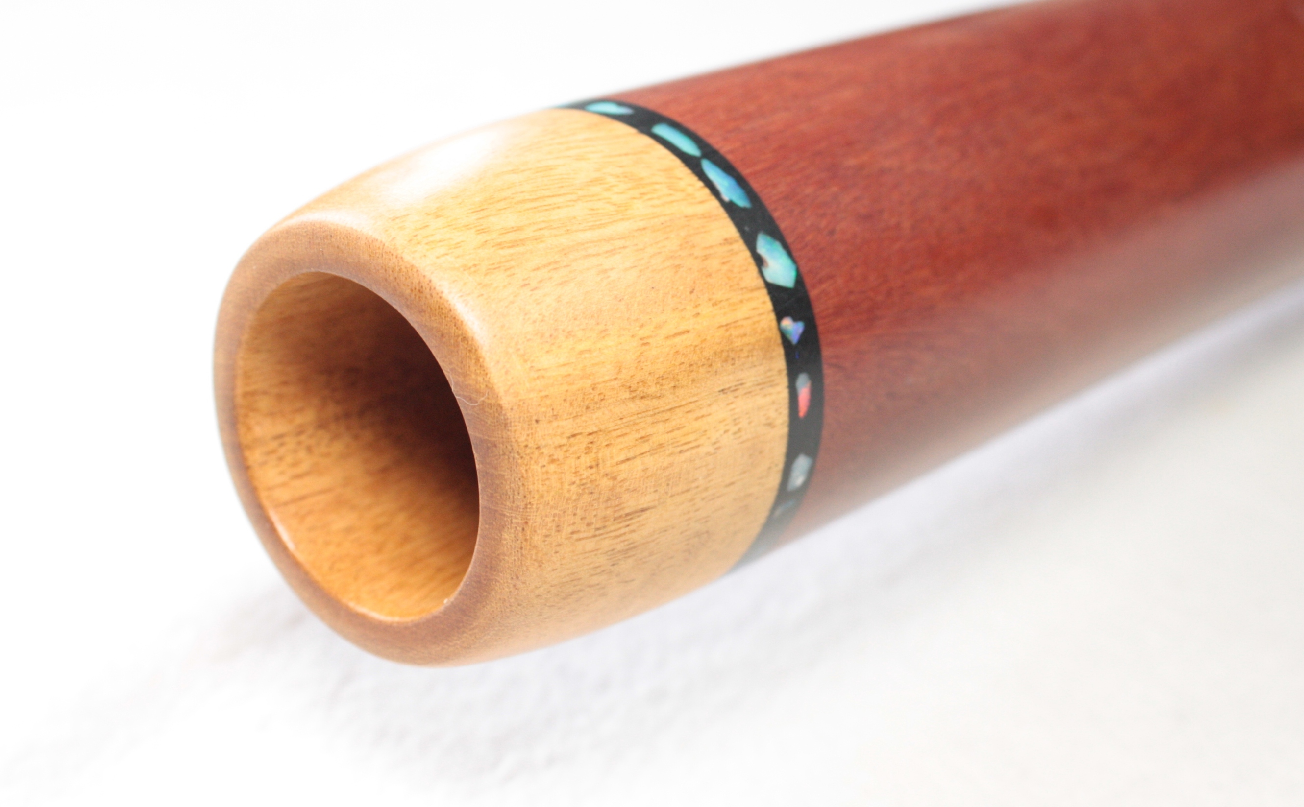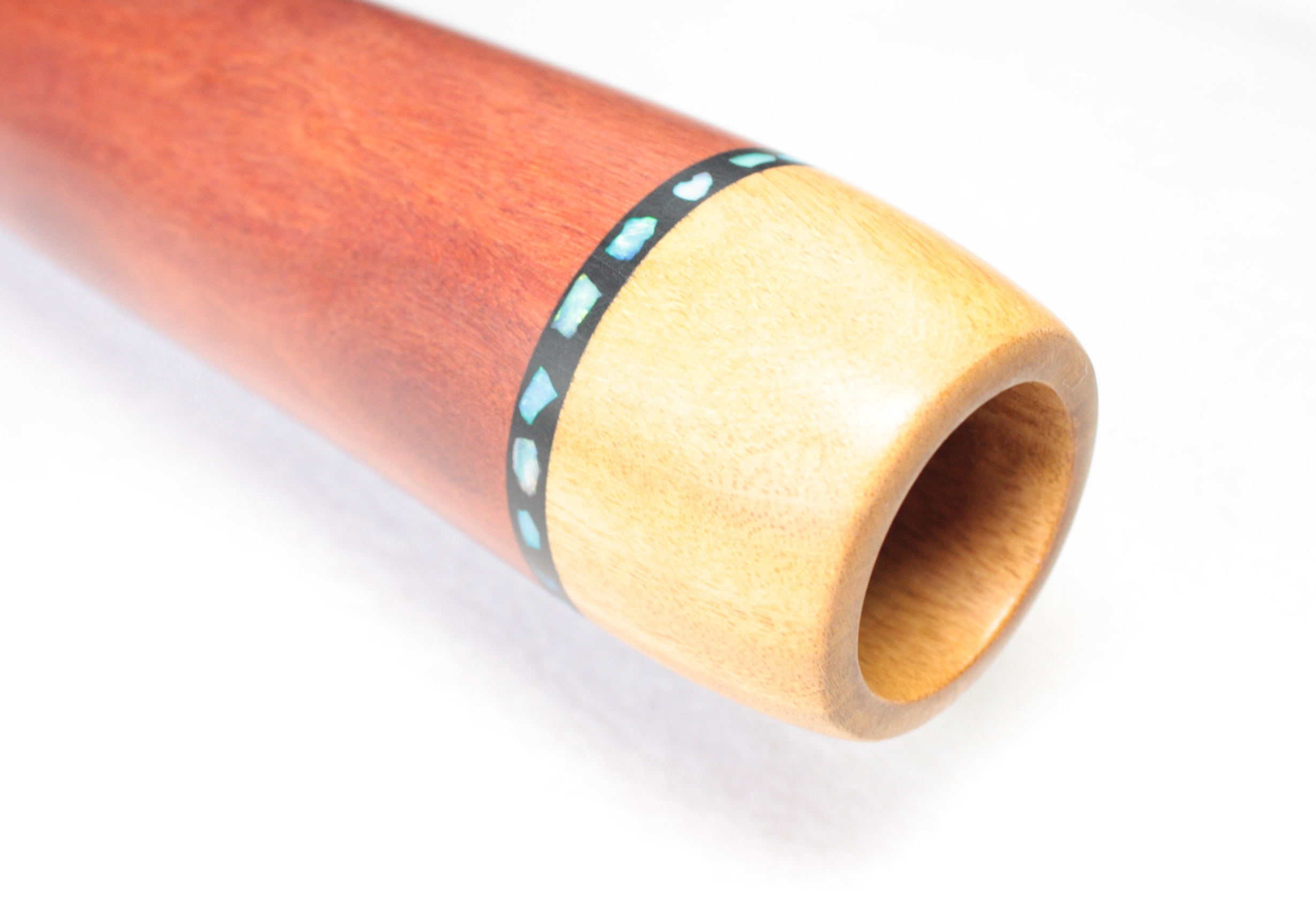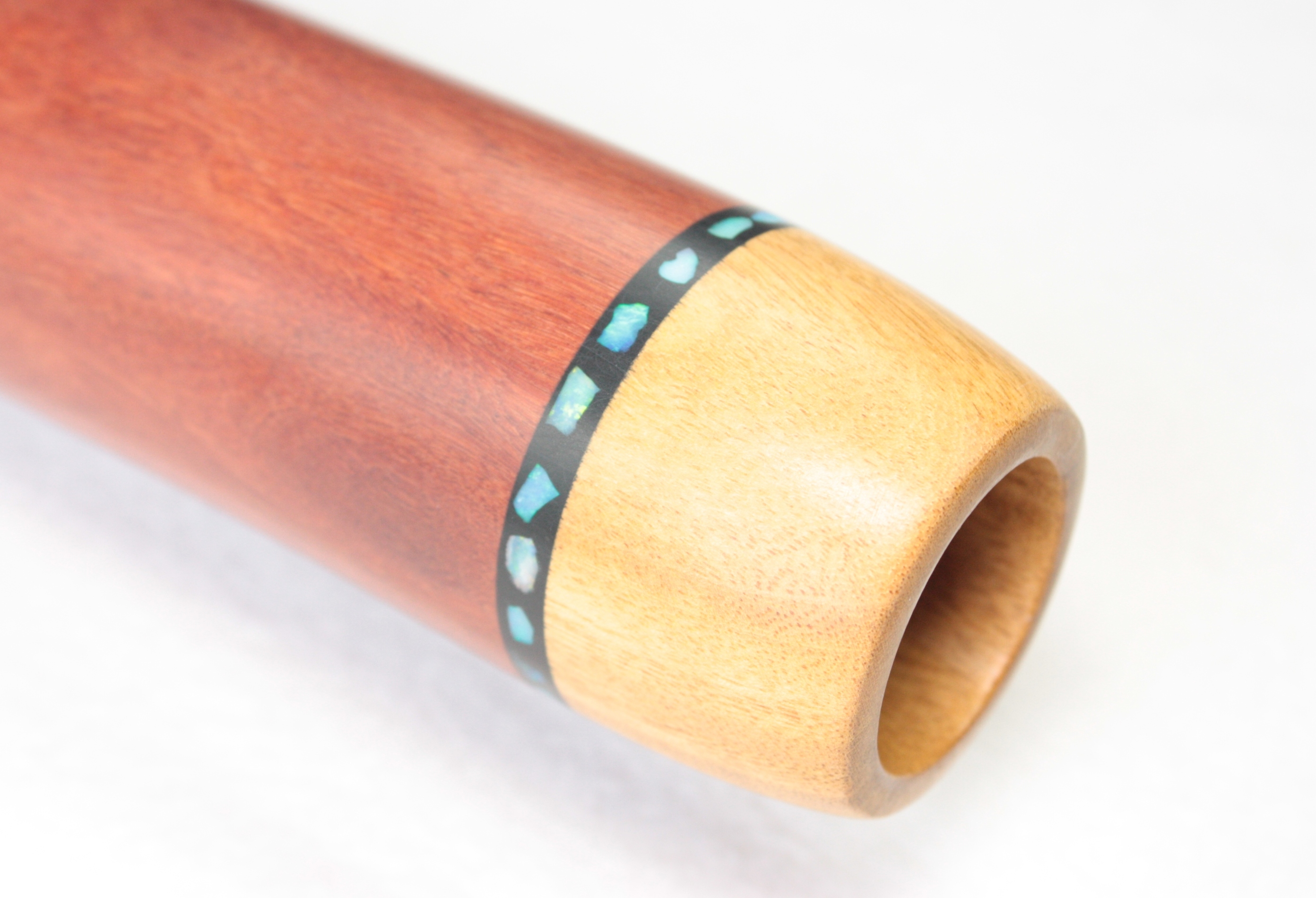 Just looking at the shape of this didgeridoo is enough to tell you it packs a punch. I love the conical column at the start, then opening up at the bell. Clearly designed for playing and responding to tongues! Ash mouthpiece with opal inlays from Lightning Ridge.