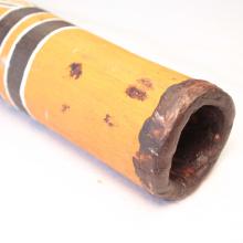 Mes Commentaires : La plupart des amateurs de didgeridoos connaissent le yidaki et sa place dans le la culture du nord-est d'Arnhem Land. Mais moins de personnes ont entendu parler du Mago. Le mago est une variante du didgeridoo, fabriqué et utilisé dans les parties ouest de la Terre d'Arnhem. La longueur est faite pour l'accompagnement des chants dans l'un des deux styles: le bunggurl style de l'Est ou kunborrk tradition de l'ouest. Ce qui est magique avec ce type d'instrument c'est qu'il est aussi possible de jouer d'autres styles de jeux que forcement du traditionnel. Ceci est du au très bon travail de la colonne d'air. Ça donne à l'instrument un son ample et bien riche en harmonique, tout en gardant quand même un timbre organique et « brut de termite ». J'attire votre attention sur le fait que ces instruments ne sont pas vernis ni à l'intérieur ni à l'extérieur. Certains peuvent avoir quelques petites fissures présentes à la cloche, mais ils sont tous jouables. Pensez bien que ce sont des instruments "Vintages" !! C'est une vraie chance de pouvoir obtenir de tels instruments de nos jours !