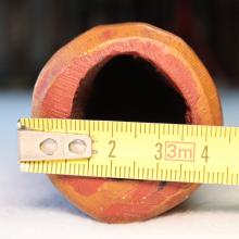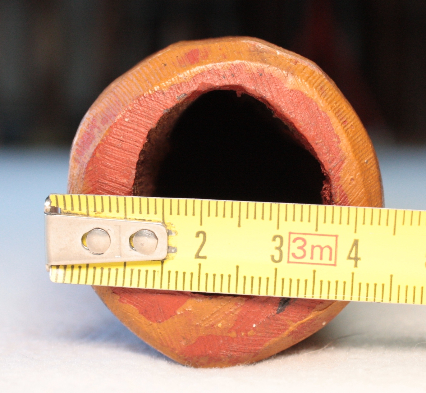 Les diamètres sont mesurés au pied à coulisse, au départ de la colonne d'air après l'embouchure. Attention ce ratio est très fiable pour un didgeridoo avant une colonne d'air avec un travail interne quasi 'lisse'. Dans le cas des instruments avec des zones de compressions, ou boules de résonance, comme ceux de Dubravko, ce ratio est difficilement calculable avec 100% de certitude. Egalement pour les didgeridoos en eucalyptus avec des galeries de termite, il arrive que le diamètre de départ de la colonne d'air ne soit pas cylindrique et fasse par exemple 4.4x3.8cm. Dans ce cas je prends comme valeur de diamètre de départ de colonne, la moyenne de ces deux chiffres. A savoir: (4.4+3.8)/2=4.1cm. Il en va de même pour la valeur de la cloche. Cela permet de donner une approche du caractère instrumental assez fidèle mais qui ne peut être mesurée avec 100% d'exactitude.